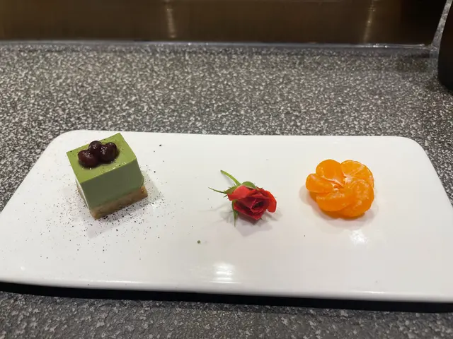 砌成花狀的蜜柑片賣相討喜,鮮明的橙色與抹茶餅的粉綠正好形成對比,兩者都入口清甜,冰涼透心。