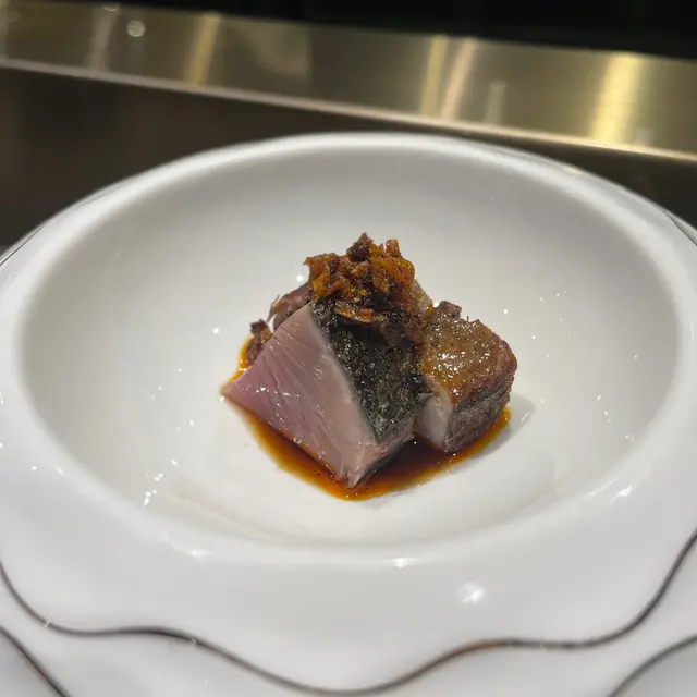 體脂超過10%的池魚以厚切呈現,鮮甜肥美,池魚的油份與無花果醬,芝麻及蔥花混和出彩,帶來極緻的鮮味。