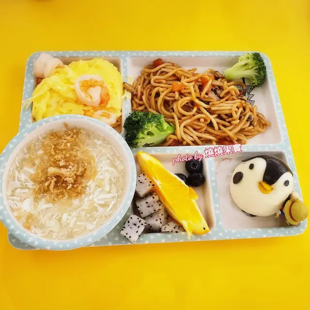 包括時令水果,雲蛋蝦仁,馬島小企鵝,鮮茄磨菇燴麵,乾貝海鮮豆腐𡙡和果汁。豆腐羹最為小朋友鍾愛,豆腐切到細絲,入口綿滑,配上蝦等海鮮,鮮甜味足夠。