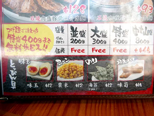 除了富士山盛需要額外加$45之外,並盛 200g、大盛300g、特盛400g無需額外收費,客人可因應自己食量選擇份量,不怕會造成浪費。