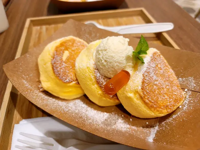 終於上枱暖粒粒,賣相也討好,第一次我更係叫幸福班戟基本野$84 , 味道鬆軟淡淡蛋香配埋蜜糖芝士Cream, 好滑好夾好輕盈唔會漏。