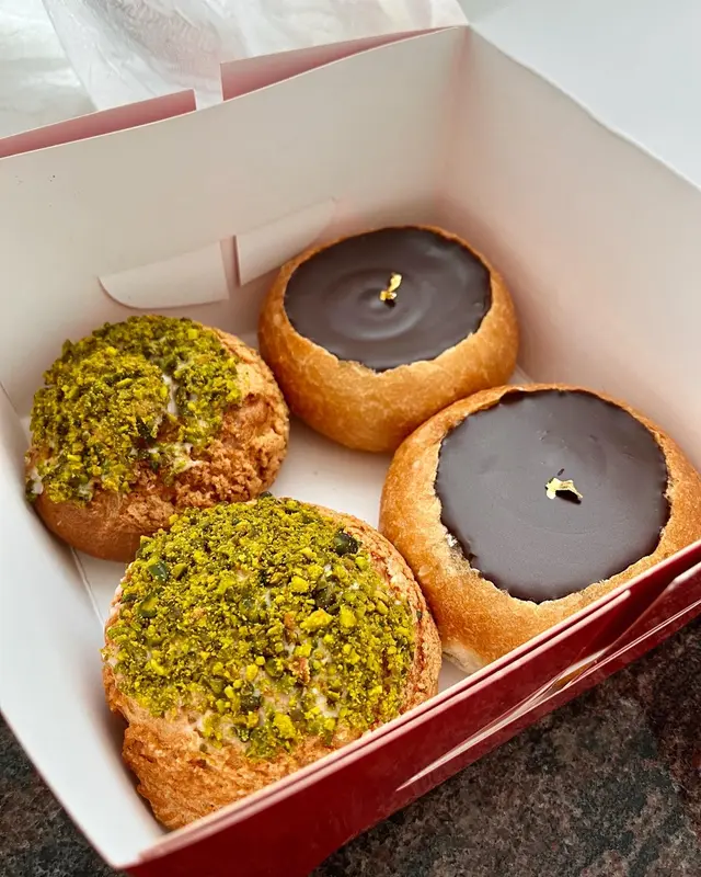 之前食過原味泡芙真係好!好!食!我仲買去投餵教練🤣開心果泡芙係每日定時出又每人限購兩個,雖然唔係開心果fan但期待值都會高少少🤏我係擺雪櫃第二日早餐先試,泡芙皮冇話變淋變軟,內餡量夠多又唔甜,不過開心果味就唔算好濃,啲味主要靠面頭嘅開心果碎碎,焗過之後果然唔同咗😃個皮會脆口啲,同埋成個開心果味都會濃啲啲,內餡更加順滑。不過比起原味呢個好似會heavy啲,我個人更鍾意原味🤭