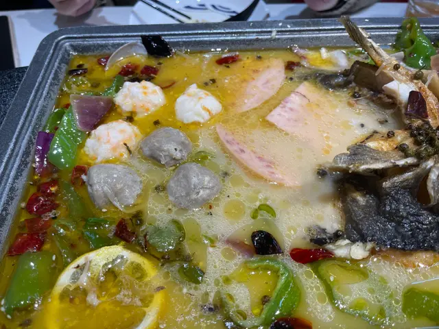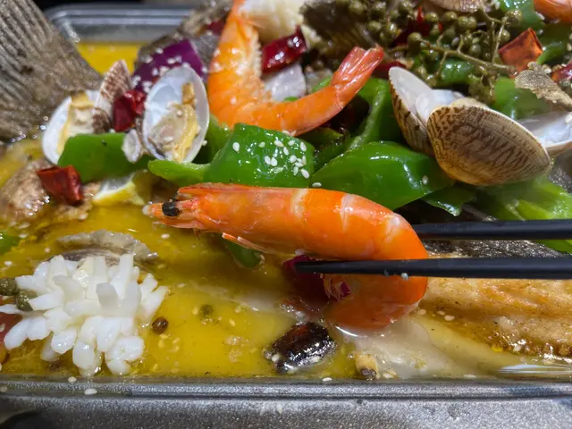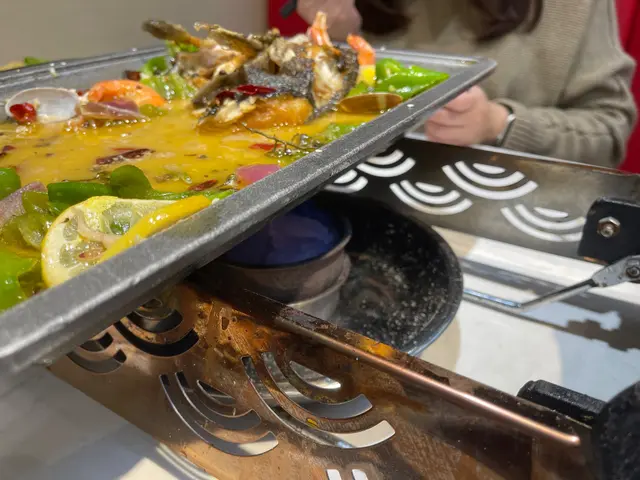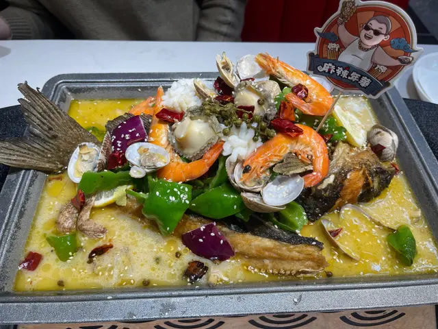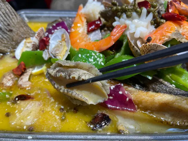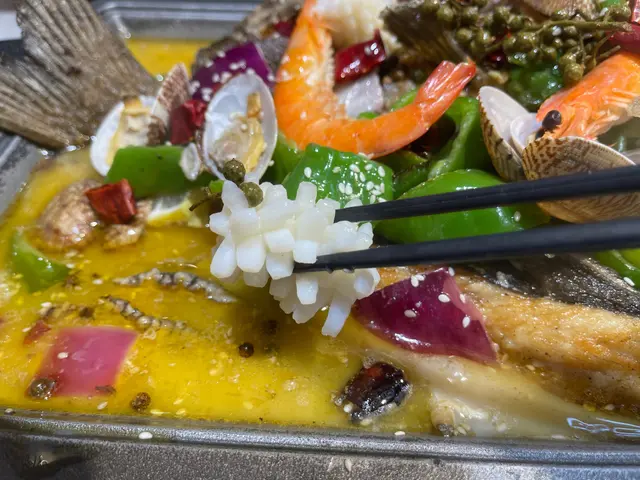 我地三個人揀左個烤魚二人餐,服務員話份量都多,條魚好大,食完唔夠可以再加配料打邊爐!我地就一於睇下條魚有幾“大”先!個烤魚等左大概10mins就上啦,真係好驚喜,原來除左烤魚,仲有鮑魚,魷魚,基圍蝦同花甲,簡直係海鮮拼盤!我地叫的係藤椒味,有少少麻辣。個味道又一次俾到我地驚喜!