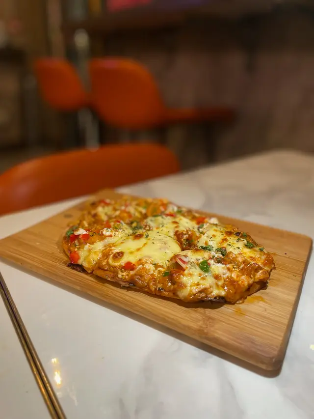 厚批、薄批、酸種批底都食過,但係印度薄餅就真係未試過!呢個饢披薩係用上咗naan做批底,再將佢烤到酥脆,撒上咗印式調味嘅雞肉同埋各種蔬菜,醬汁微辣但係超級濃郁。