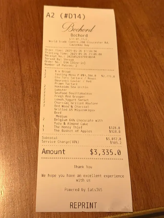 Tasting menu $1,388/ head