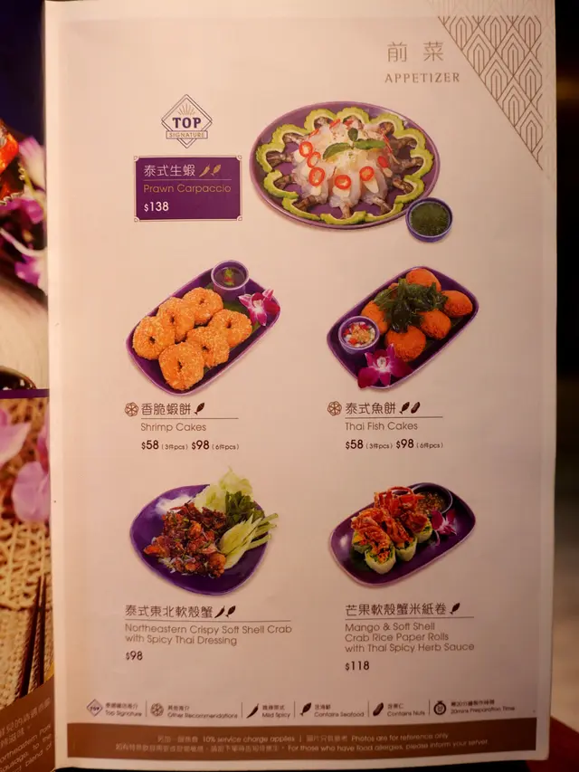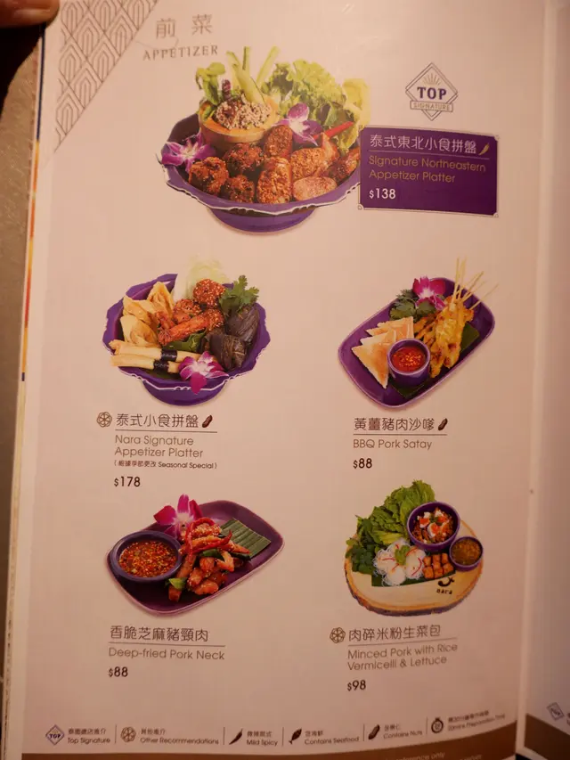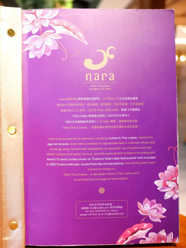 餐廳以泰國家常菜為出發點,展現泰式正宗傳統料理的同時,也不斷地變化出風情萬種的精緻泰式菜色,創造豐富多樣化的選擇,店內還可以互點主打泰西fusion菜的Lady Nara餐牌,款式繁多。