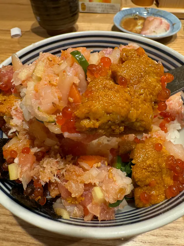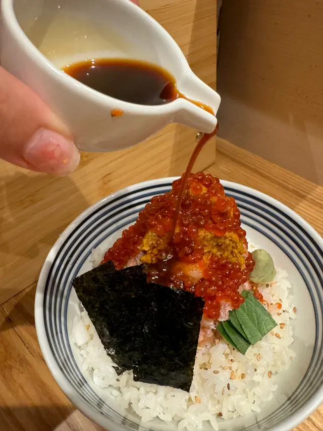 混和了醬油跟Wasabi,之後慢慢添加於丼飯之中,十分美味,魚生不單止鮮甜,而且混和了飯粒一起進食相當好味 。每一啖飯都會吃到不同的海鮮。味道跟口感都相當好。