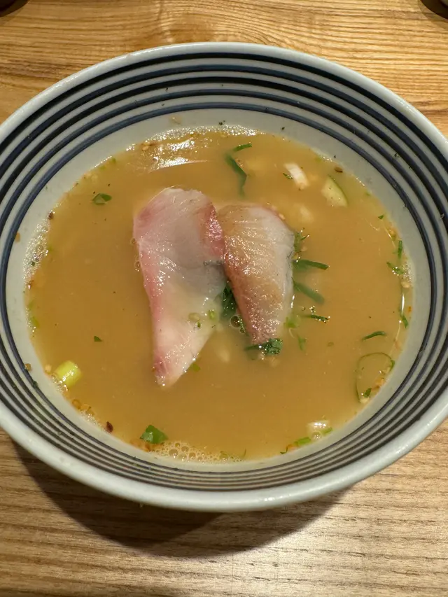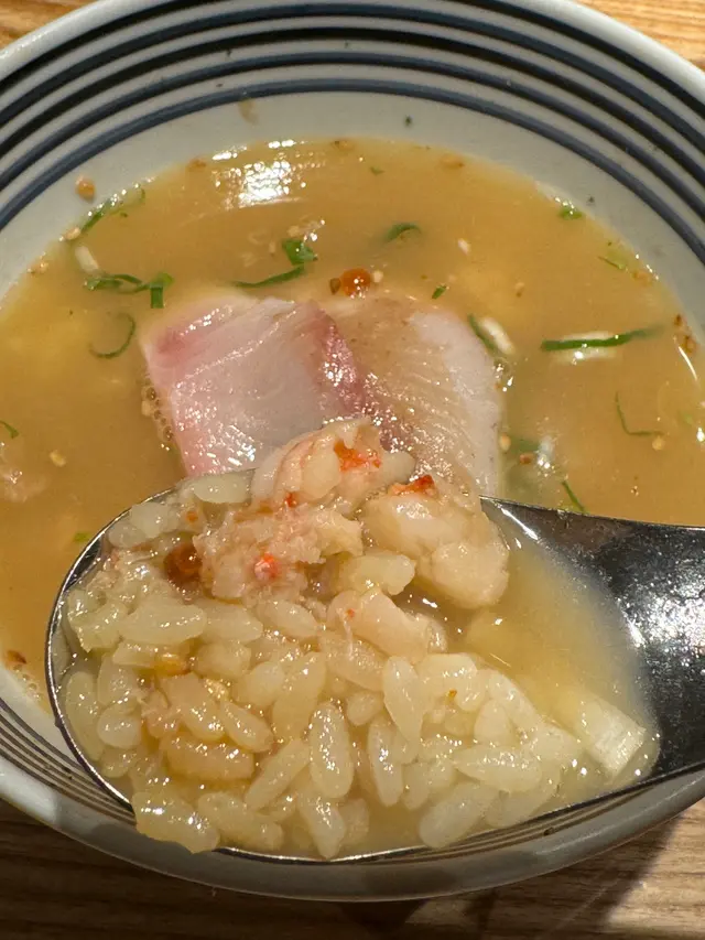 一丼二吃當然沒有這麼簡單,當吃剩了三份一的丼飯,可以叫店員添上鯛魚湯,看到廚師會即場加熱和調味鯛魚湯。不用一會兒熱辣辣的鯛魚湯便送上。然後慢慢地加個丼飯之中,再把先前預留的兩片刺身放到湯飯內。