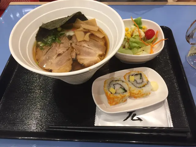 依個係醬油海藻烏冬,裏面有烏冬,沙律同加州卷。醬油海藻烏冬嘅烏冬有好濃烈嘅海藻味,叉燒好痳,湯底好濃郁