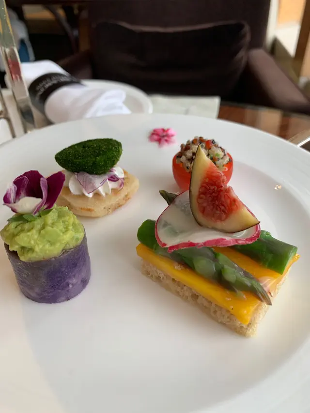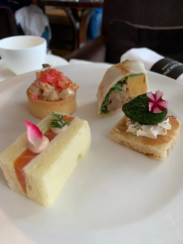 鹹點方面有四款,其中兩款比較好食係個碳煮鮑魚、粉紅魚鬆、櫻花潢物迷你撻同埋叉燒沙律、玉子、蕪菁墨西哥卷餅,但鹹點整體唔算好突出~