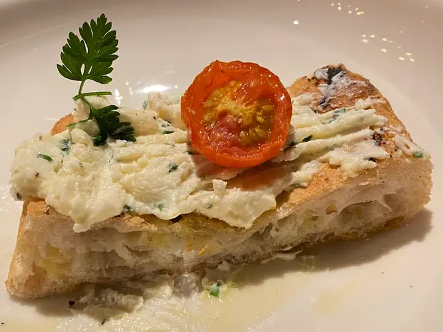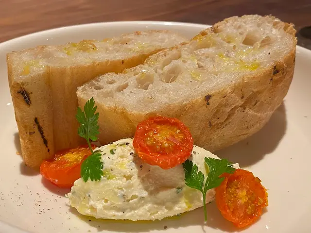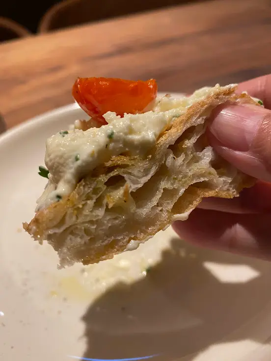 這裏的餐包絕對不是一般貨色,而是充滿南歐風情的西班牙鬆脆包。外層烤得香脆,裏面卻鬆軟無比。配上香蒜希臘芝士醬、油浸蕃茄和初榨橄欖油,好吃得欲罷不能。