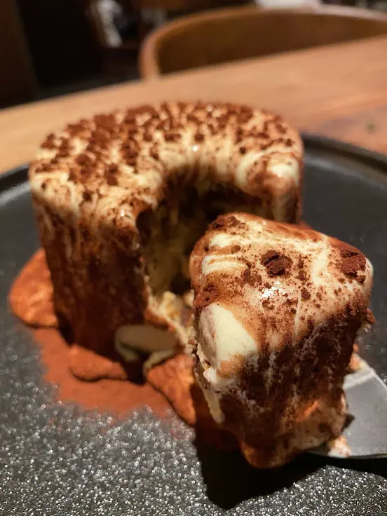 這道甜品之所以被稱為 Tiramisu Lava 提拉米蘇熔岩,就是因為它質感比較柔軟,只要拉起外面的膠圈,忌廉芝士醬就會向外瀉,就好像火山爆發流出來的熔岩一樣,一發不可收拾。