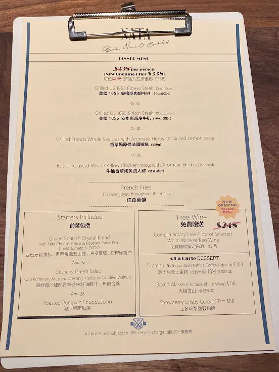 也許是新開張的關係,餐廳提供不錯的優惠。 除了新張期內有八五折優惠,品嚐晚餐可以免費無限添飲指定紅酒白酒,抵上加抵。