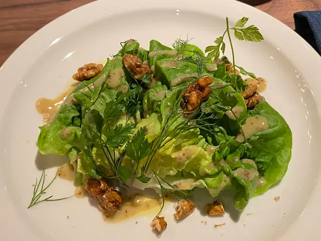 首先出現的前菜是翠綠青沙律及配香草芥末籽油醋汁,上面灑上焦糖合桃,沙律菜新鮮翠綠,合桃香脆有口感,和我們吃的琥珀蜜桃有點相像。沙律酸酸甜甜的感覺,剛好引起我們的食慾。