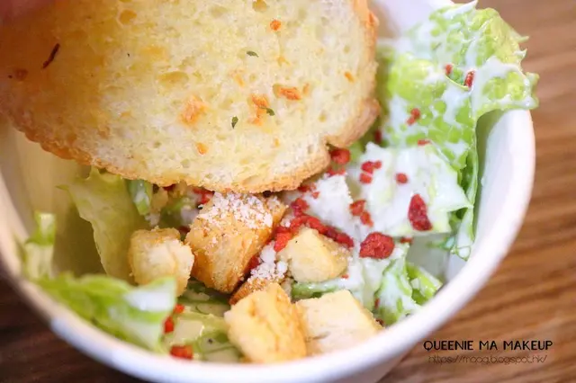沙律生菜配搭脆脆麵包粒,再加上煙肉粒