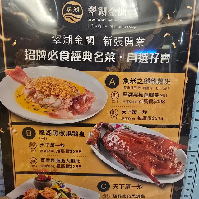 翠湖中的驚喜 安兒安兒Level 32025-09-201K views Follow 8月底,坐完鴨靈號維港遊,在尖東落船,就在附近一帶覓食。結果在新開的翠湖金閣試吓,點了幾款餸,普遍水準不錯,味道幾好:1. 自選孖寶:魚米之鄉龍躉班 + 燒鵝2. 蒜蓉蒸蟶子皇3. 日式燒汁牛柳粒4. XO醬天下第一炒特別要提他們的招牌菜“魚米之鄉”,除了那條鮮美嘅魚,還有香脆炸米,上枱時再淋上濃香魚湯,吃那脆米湯飯,驚喜好味道,都不用再叫白飯了。吃畢,送了杞子雪耳糖水給我們。4人共吃了~$1200,人均~$300又多個食飯好去處,日後可以再來,試試其他菜色。魚米之鄉龍躉班XO醬天下第一炒黑椒燒鵝日式燒汁牛柳粒941#香港美食 The above review is the personal opinion of a user which does not represent OpenRice's point of view.1Share翠湖中的驚喜 翠湖金閣 https://s.openrice.com/QrKT0Ge1U00Report Post Ratings5Taste5Decor4Service5Hygiene4ValueRecommended Dishes魚米之鄉龍躉班XO醬天下第一炒黑椒燒鵝日式燒汁牛柳粒Date of Visit2025-08-25Dining MethodDine InSpending Per Head$300 (Dinner)