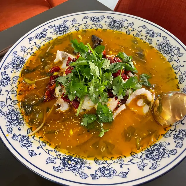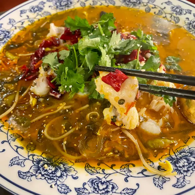 先飲一啖金黃色高湯,味道酸酸辣辣仲帶點麻舌,飲一啖已經想追住試埋塊鱸魚,超鮮爽滑又冇骨,配料有酸菜、芽菜、寬粉,加上秘制老壇風味,同行嘅國內朋友話呢度嘅老壇酸菜鱸魚甚有水準,值得再三回味!