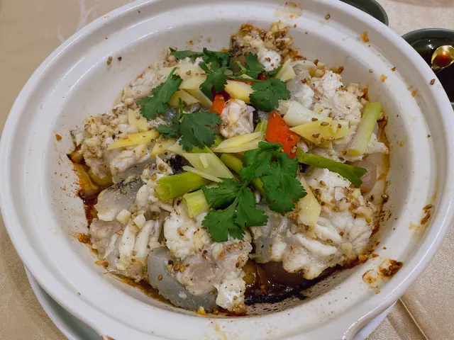 生焗胡椒花尾躉~以蒜子、乾蔥頭、薑角、焗香蔥胡椒等香料鋪底,肉質鮮味嫩滑,含豐富骨膠原。