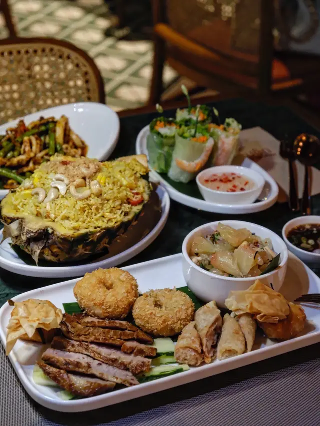 首推泰式小食拼盤😍 有柚子沙律、蝦餅、蝦餛飩、春卷和豬頸肉。