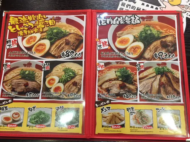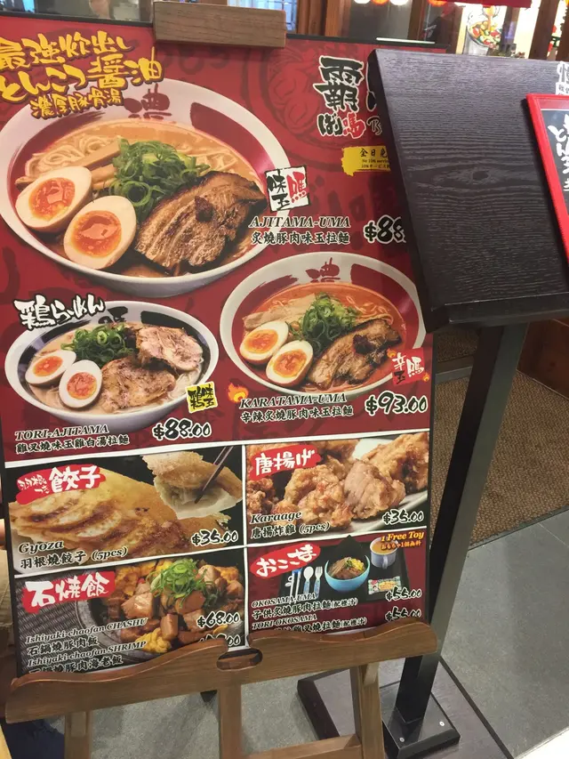 桌上整齊的放著一樽一樽調味品,侍應還體貼的問:你們想喝凍水還是暖水? 我們在看Menu,問侍應雞白湯及豬骨湯有甚麼分別?原來雞白味道較清新,而豬骨湯湯底較濃厚~我跟朋友也是愛口味較濃的豬骨湯底~我點了辛辣炙燒豚肉味玉拉麵,而她點了炙燒豚肉味玉拉麵~我們還點了一個抹茶雪糕~