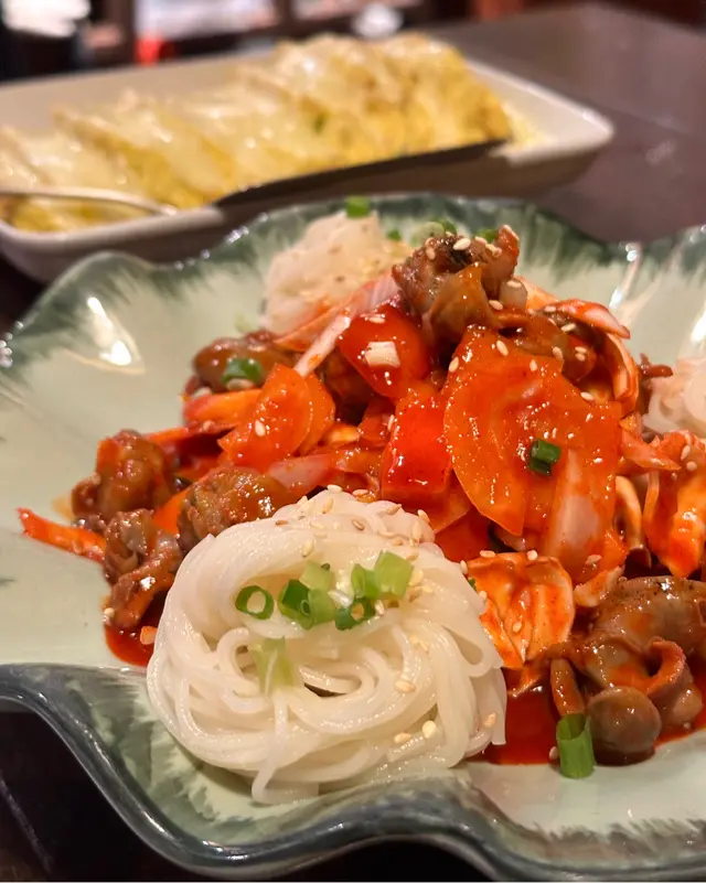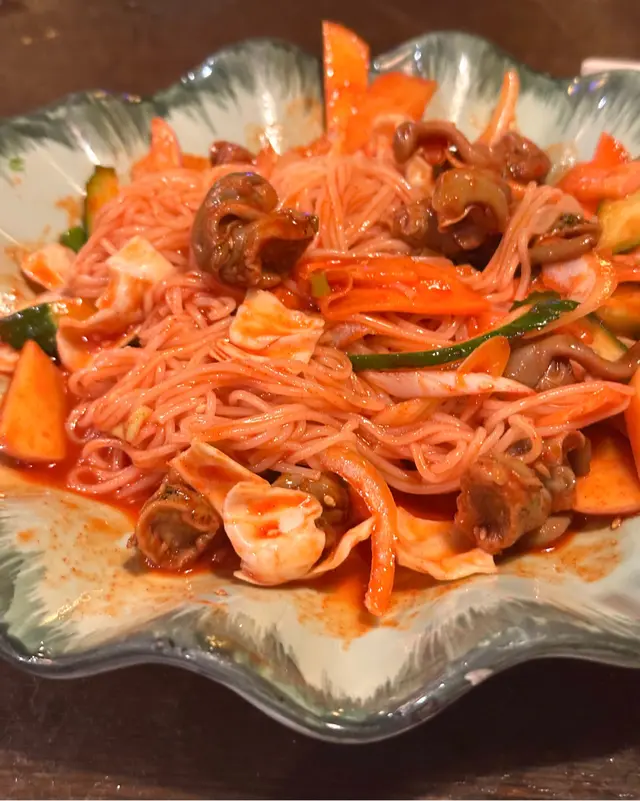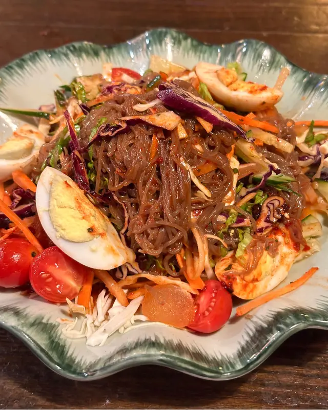 天氣熱,叫咗兩個涼拌菜share食,見到顏色鮮艷嘅擺盤,已經食慾大增,其實撈麵都要有啲技巧,好彩阿豬媽好好人有幫手,麵條煙韌彈牙,醬汁酸酸地,配菜有青瓜、紅蘿蔔、椰菜、梨肉、蘋果、車厘茄同雞蛋,全部切絲,口感超級豐富~