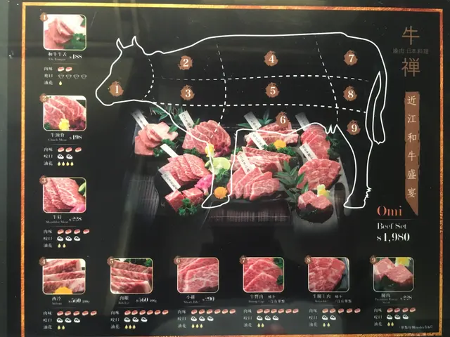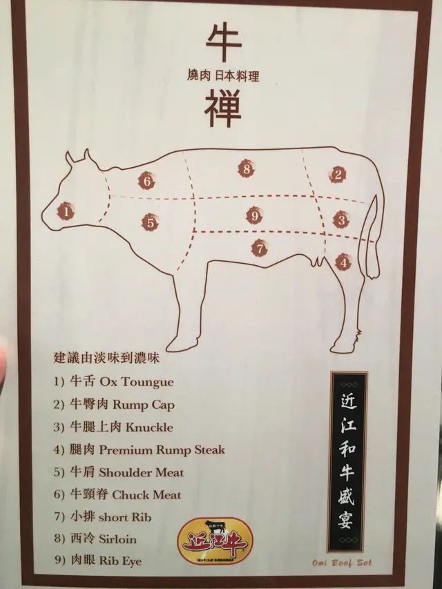 戲肉來了!店員揣來了一隻牛狀的板,九個部位一覽無遺。