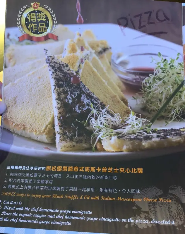 看看餐牌, 一掀開就見有得獎作品 ~ 黑松露菌醬意式馬斯卡普芝士夾心比薩(16吋)($108),這個係必食作品,即使我不是芝士控,但味道真係一流,pizza個面灑上巴麻臣芝士,外表香脆 ; 中間有馬斯卡普芝士同黑松露菌醬,質感香軟,不沾上任何醬汁,巳齒頰留香 ; 食得多芝士總會有"漏"嘅時候,這時沾上餐廳自家製的提子香醋汁及加上有機蔬菜,另有特色,令人回味。