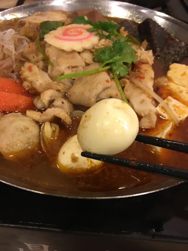 呢個黑麻油雞鍋,採用啖啖雞脾肉,配料有玉子豆腐、台灣米線、蜆等等,湯底用黑麻油,味道濃厚,認真吸引。