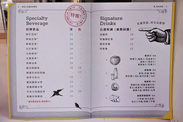 鋪仔細細,一眼就睇晒,而餐牌設計成一本小書,果然文青,打開睇睇,簡單分咗「招牌飲品」及「自選特調」兩大類,無一般台式茶飲店咁花多眼亂嘅選擇,似乎以貴精不貴多為主線,但有好多加配元素,定價亦相宜:)。