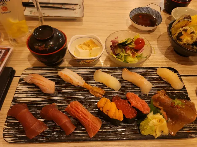 壽司分別有三文魚,赤海蝦,海膽,鯛魚,香蔥吞拿魚蓉,白身魚壽司,鮪魚赤身,魚籽壽司和西冷牛肉壽司。壽司款式各有不同,刺身高質新鮮,壽司飯的質地柔軟黏稠,每粒米粒都經過精心的煮煮冷卻處理,使其能夠在卷壽司時較容易成形。