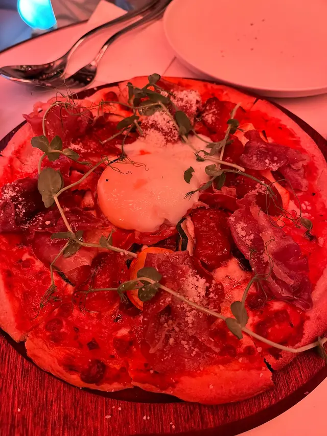 Pizza是薄批, 目測大約10寸, 適合2人作主食分享。巴馬火腿、辣肉腸和溫泉蛋, 再配以紅醬, 這個組合在Pizza界簡直「沒得輸」, 批的crust烘得乾脆可口, 喜歡吃批邊的朋友一定會喜歡這款pizza。