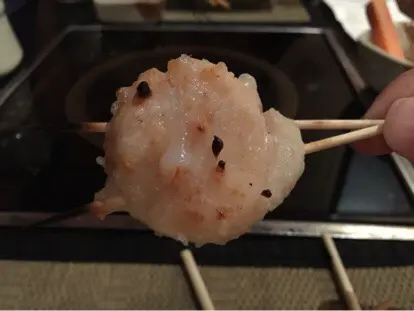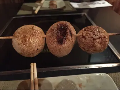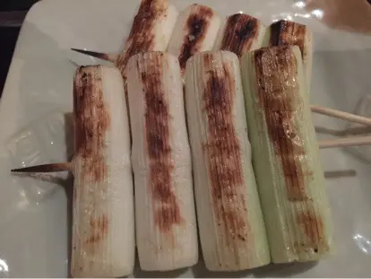 之後有燒青蔥。整串都用蔥白,卻是整氣蔥最鮮嫩多汁甘甜的部份,外層微脆,齒頰留香。之後有烤白。烤至脹卜卜,菇味不太濃郁,但勝在夠多汁,入口也十分鮮甜,灑點七味粉,吊出白菌本身的鮮味。