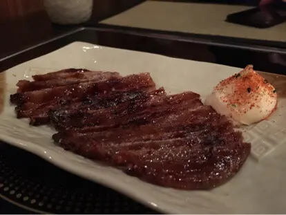 食燒物的好處便是一餐可以品嘗多款食物種類,滿足貪心的我們。先有蔬菜拼盤作為頭盤,有蘿蔔,青瓜,西芹,椰菜,全是生的。附以海鹽及味道像海鮮醬的特製醬汁,入口脆甜十足,沒有半點清澀味。