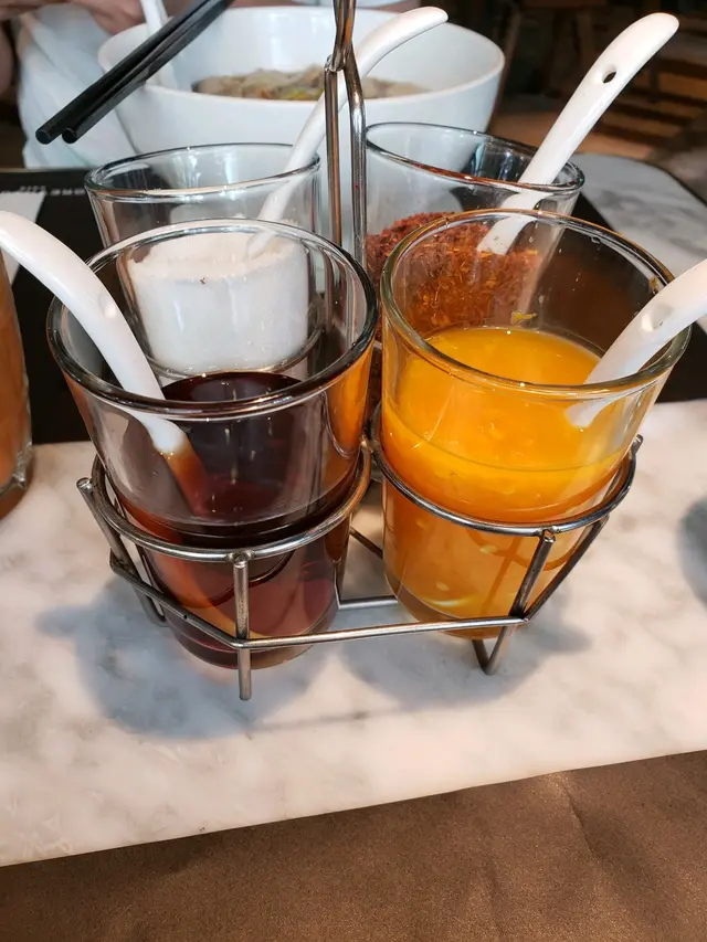 更特別係配上四款調味料,紅色同橙色兩款係辣嘅,紅色係比較常見嘅辣椒碎,橙色嘅就好特別,自家制嘅熱帶水果汁加上辣椒,真係清新得嚟帶點辣,好開胃。而另外兩款調味就係粗鹽和魚露。