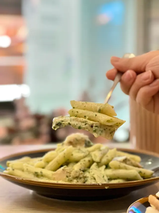 青醬忌廉汁夠晒creamy,意粉好掛汁,食落微微有青醬既清新,而雞肉係用左雞胸部分,肉質非常軟淋,一啲都唔嚡,同長通粉好夾😋整體調味唔會太鹹,感覺輕盈清新😋