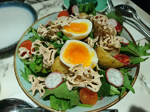 個蓮藕沙律頗特別,d 蓮藕乾好香。但個溏心蛋我食完後唔多舒服。