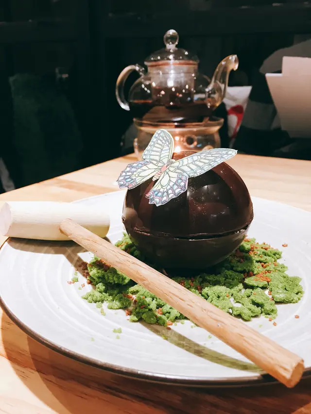 甜點點了吸引了我來的(只剩最後一個,超lucky的)。外面是巧克力做的球型,裡面是冰淇淋。好看是好看,可愛是可愛,但就只吃到甜而已。。夠有的味道都。。。沒有。。