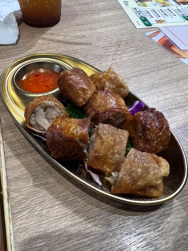 追加一個雞皮卷小吃,外皮是薄薄脆脆的,口感似腐皮多個似雞皮,𥚃面包著雞肉,配搭甜酸雞醬很夾。