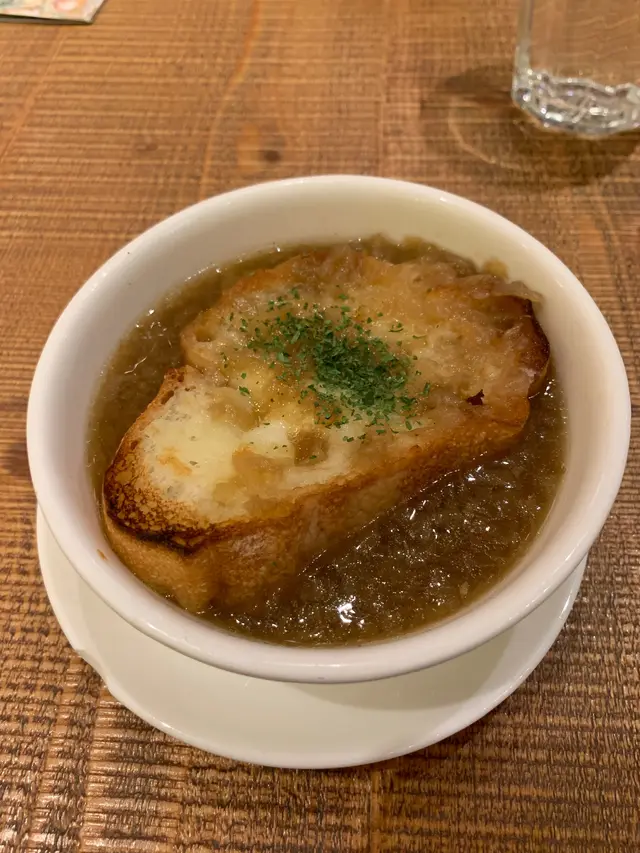 法式芝士洋蔥湯: 湯裡有一塊帶有芝士的麵包, 加入非常多的洋蔥碎, 你會有意想不到的味道和感覺, 也會飲到洋蔥的鮮甜味。
