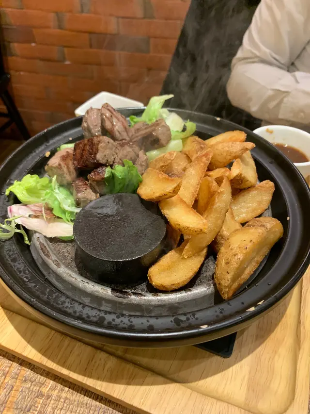 香烤安格斯一口牛柳: 有驚喜之作, 鐵板上的牛柳, 配上新鮮炸起的薯角。牛柳看似很熟, 但食落完全唔軔, 十分入味。