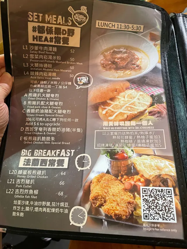 餐牌密密麻麻嘅項目,港式、西式、日式、大碗飯、芝士溶岩類別等,坐底揀緊食咩嘅時候除咗睇午餐之外,我都順便睇埋下午茶有咩食,諗住下次試吓,嗰時侍應見到我睇下午茶Menu,就同我講:你唔好睇呢啲啦,依家呢個時間冇得叫㗎!”。