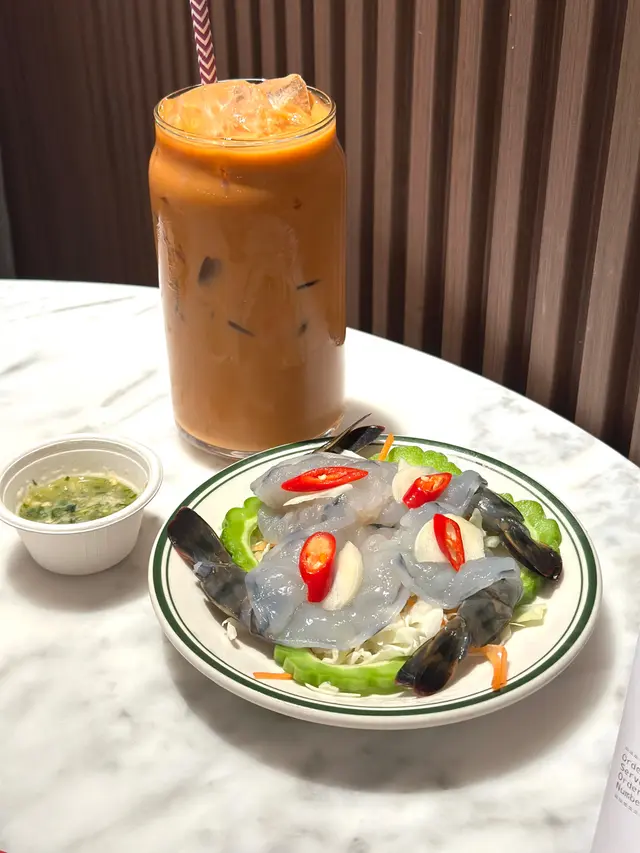 🦐 泰式生蝦:蝦肉冰涼爽甜 配上濃郁酸辣醬汁同蒜片 一啖一件 超開胃 👅