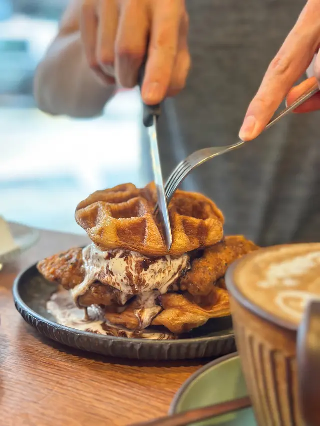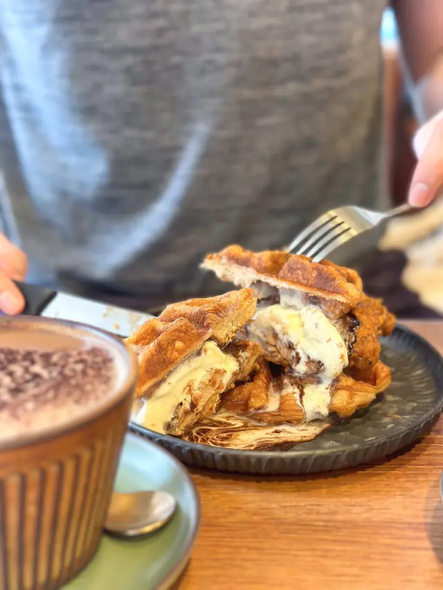 Croffle同樣係店內人氣熱賣,酥脆香口😋,夾住大大球雪糕同炸雞一鹹一甜帶點微辣🍨,一熱一凍🧊,冰火交融為味覺帶來無限衝擊💥!