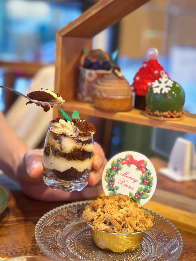 🍰 紅色聖誕樹造型嘅Red Forest Tree最先吸引目光🎄, mousse cake中間有blueberry jam,甜而不膩😍!