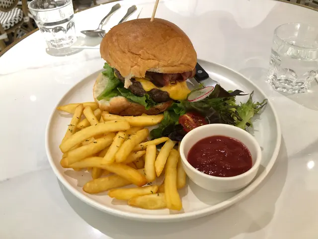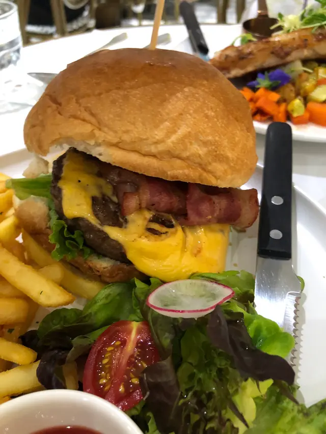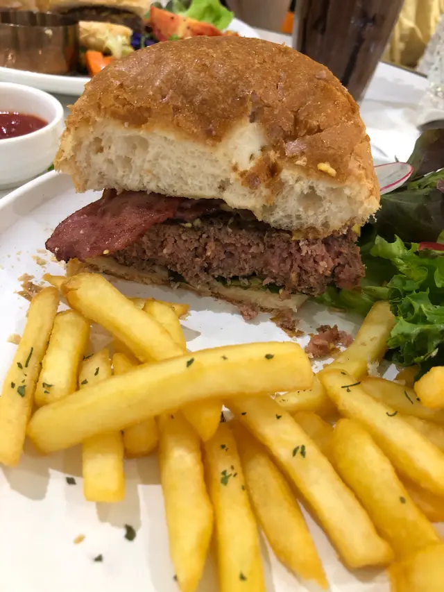 我叫咗牛肉漢堡🍔配薯條🍟 Burger有幾片煙肉,令味道更有層次😎 BBQ醬好好味,可以再多一點🤣 薯條夠熱夠脆,最後當然食晒😋