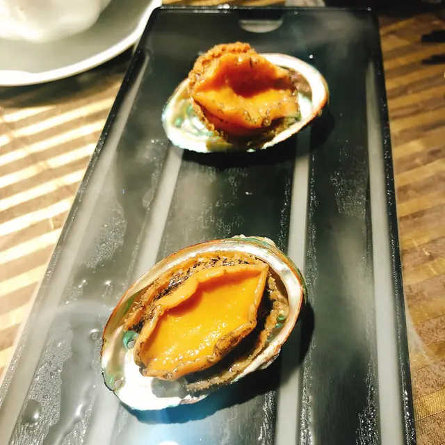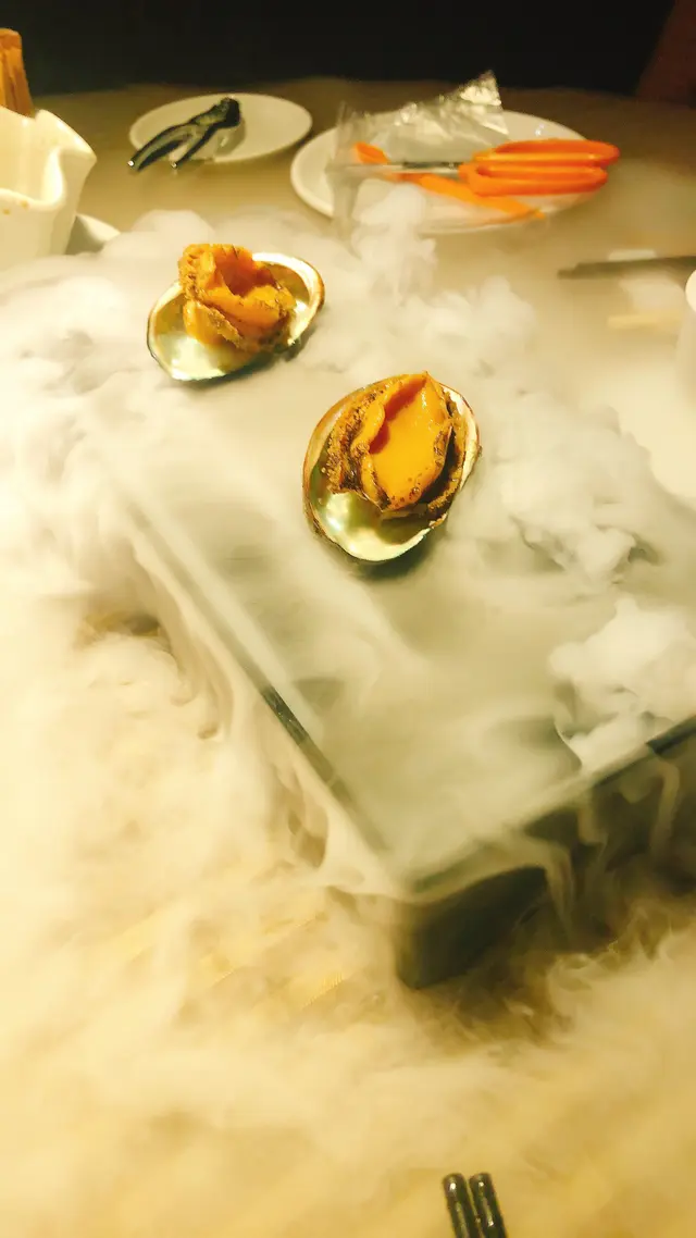 話梅花彫鮑魚上枱時充滿仙氣,因為盛盤下放了乾冰,店員灌入清水之後,鮑魚就好似置自雲霧中,客人未食先興奮🤪。