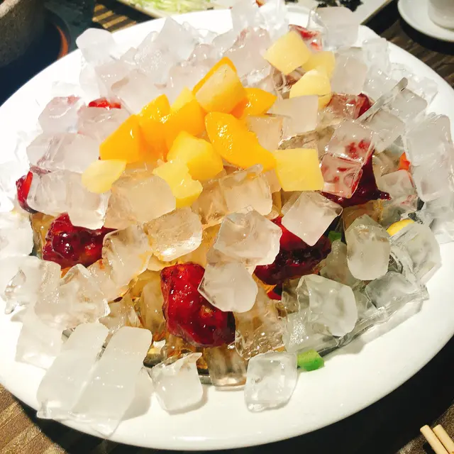 招牌菜之一冰鎮咕嚕肉,大大碟冰埋藏著炸過嘅咕嚕肉,以冷熱交融效果令外皮更酥脆。但可惜炸皮太厚,面層糖漿太甜,食了兩件巳經感覺很膩。豬肉無肉味,肥瘦不勻稱,有點失望😞!