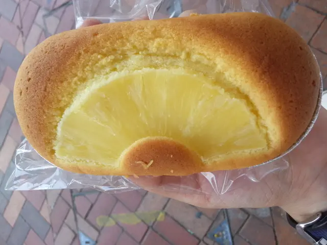 蛋糕用錫紙盤盛着,外面用透明小膠袋包着。蛋糕約有大半隻手掌的長度,面頭有一塊極薄的菠蘿片。咬下去蛋糕偏乾身,但十分鬆軟,蛋糕帶菠蘿香,整體來説很不錯,若菠蘿片再厚一點就好了。