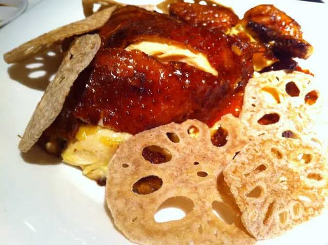 炸子雞,其中一味招牌菜,每次都忍唔住一定要叫黎食 ﹗全隻要 HKD380,即叫即炸。因今晚主角係脆皮北京填鴨一大隻,所以半隻雞夠喇,怕食唔晒。貴係貴啲,但當然有佢既原因啦 ﹗皮脆肉嫩、即叫即炸熱辣辣 ﹗雞味濃、肉汁豐富、質感滑溜 ﹗啖啖肉又機乎無肥膏,只有香脆雞皮配上薄薄一層油脂 ﹗無得彈 ﹗不得不提既炸藕片,香脆非常,好特別。
