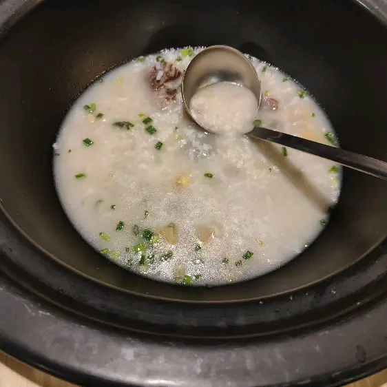 最後仲有海鮮粥底做結尾, 吸收曬海鮮精華, 個粥本身都有芋頭, 豬骨, 粟米等, 另外仲會加上蔥同菜脯, 粥底好綿密